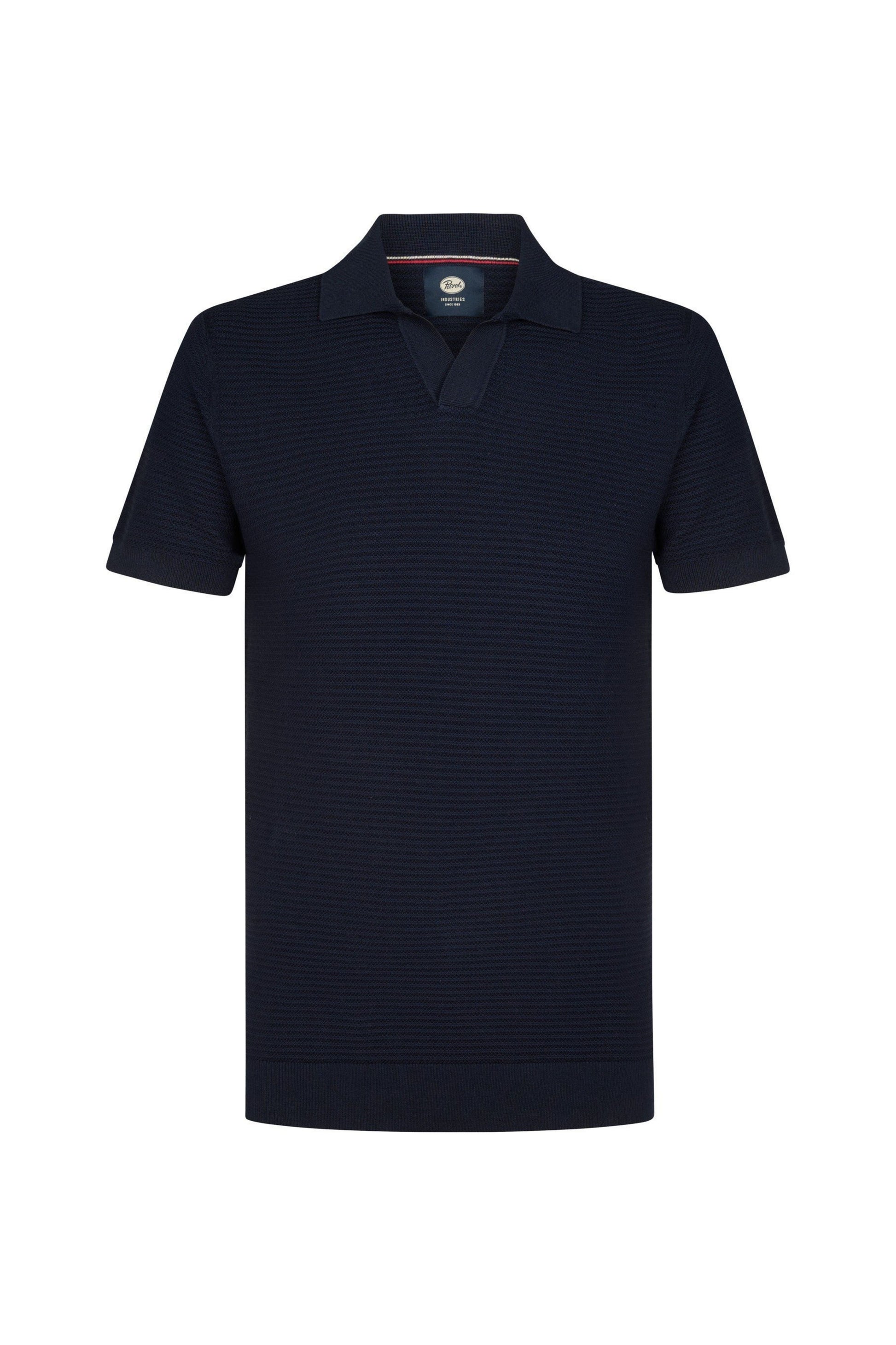 Gebreide polo met een normale pasvorm. Open V-hals, korte mouwen met geribde boorden en een rechte zoom. Horizontale structuur in dezelfde kleur zorgt voor een subtiel effect. Afgewerkt met een klein geweven mouwlabel en een contrasterend nekbandje aan de achterkant.